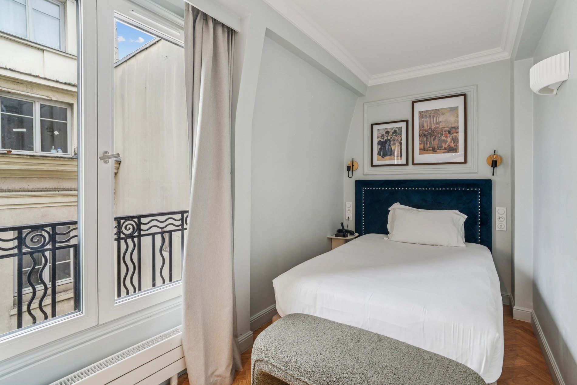 Elles disposent d’un lit double 160x200, d’une salle d’eau moderne avec douche et d’une décoration soignée, entre authenticité parisienne et confort contemporain.Le choix idéal pour un séjour à deux, alliant espace, lumière et raffinement au cœur du 2ᵉ arrondissement.