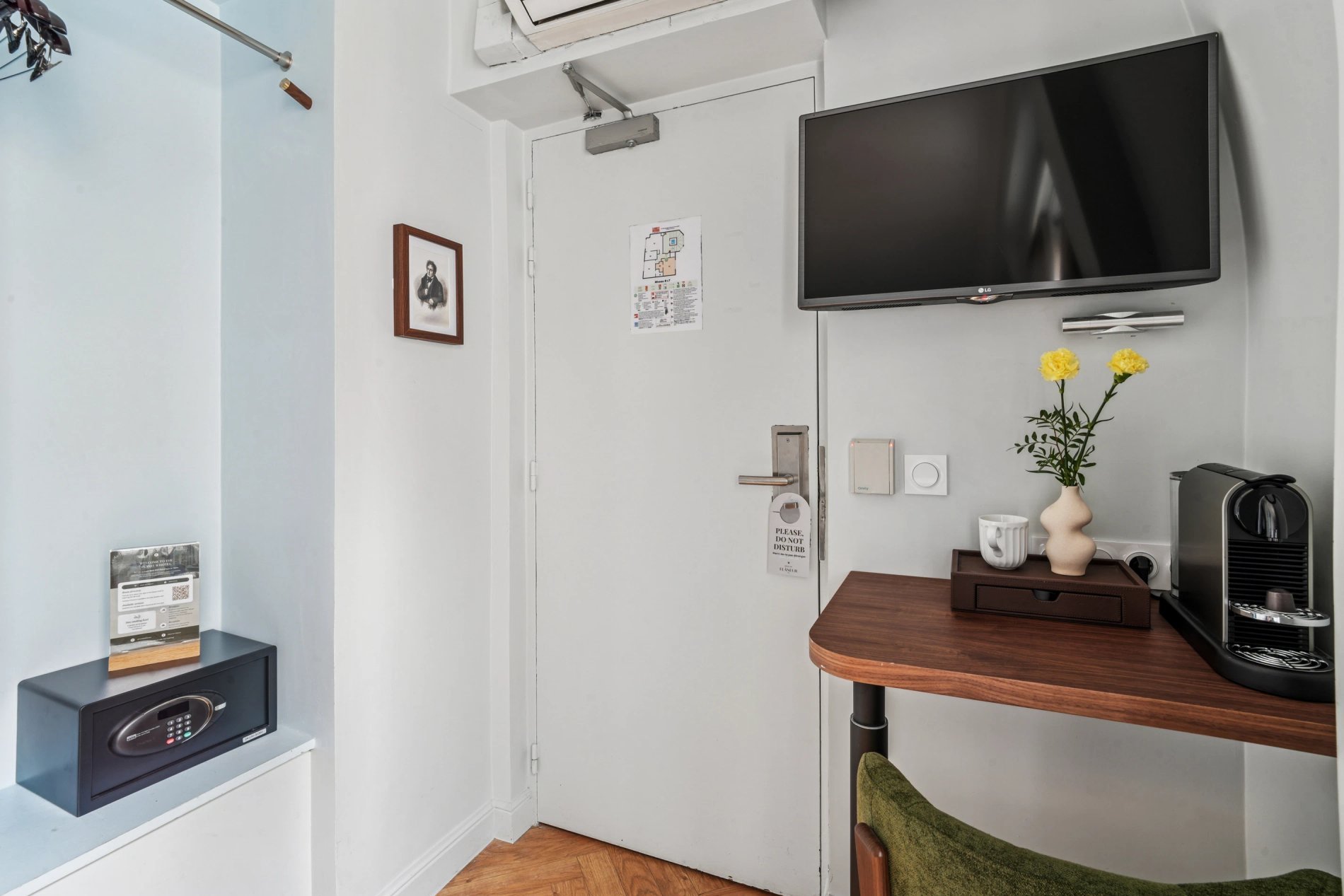 Dotée d’un lit 120x190, d’une salle d’eau moderne avec douche et d’une vue paisible sur la cour, elle offre un cocon idéal pour se reposer après une journée à Paris.Un espace fonctionnel et apaisant, pensé pour allier confort et tranquillité.